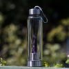 A natural mineral bottle, beautifully cut with a gold coloured screw-in lid, which has a link each side to fix to a chain so it may also be worn.