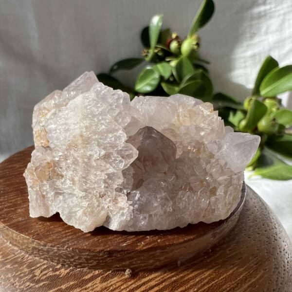 A flattish amethyst spirit quartz cluster on a little natural quartz. Very pretty and sparkly as is typical of this formation. The shape when viewed from above, is reminiscent of Africa which is rather lovely, given where it was found. A special treasure.