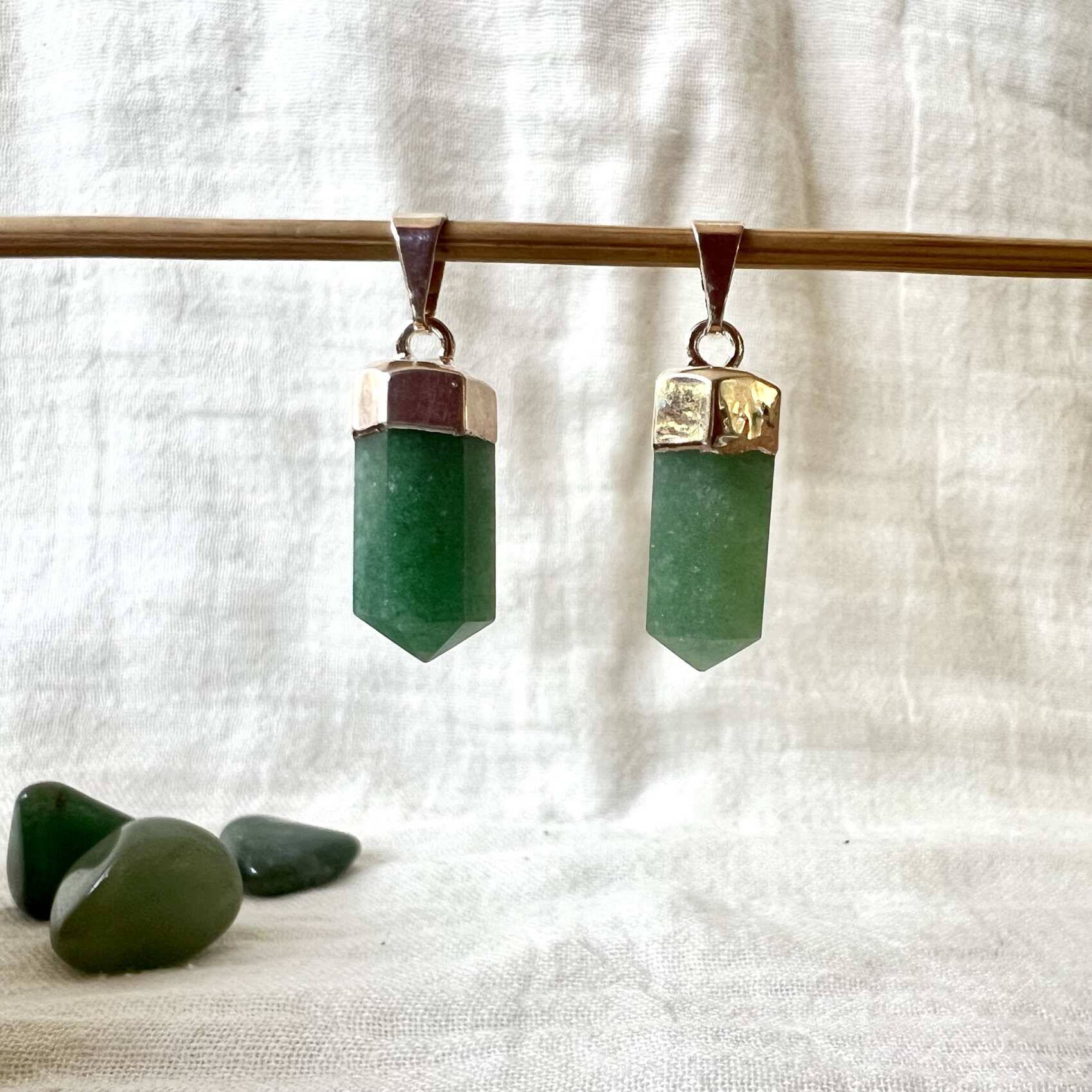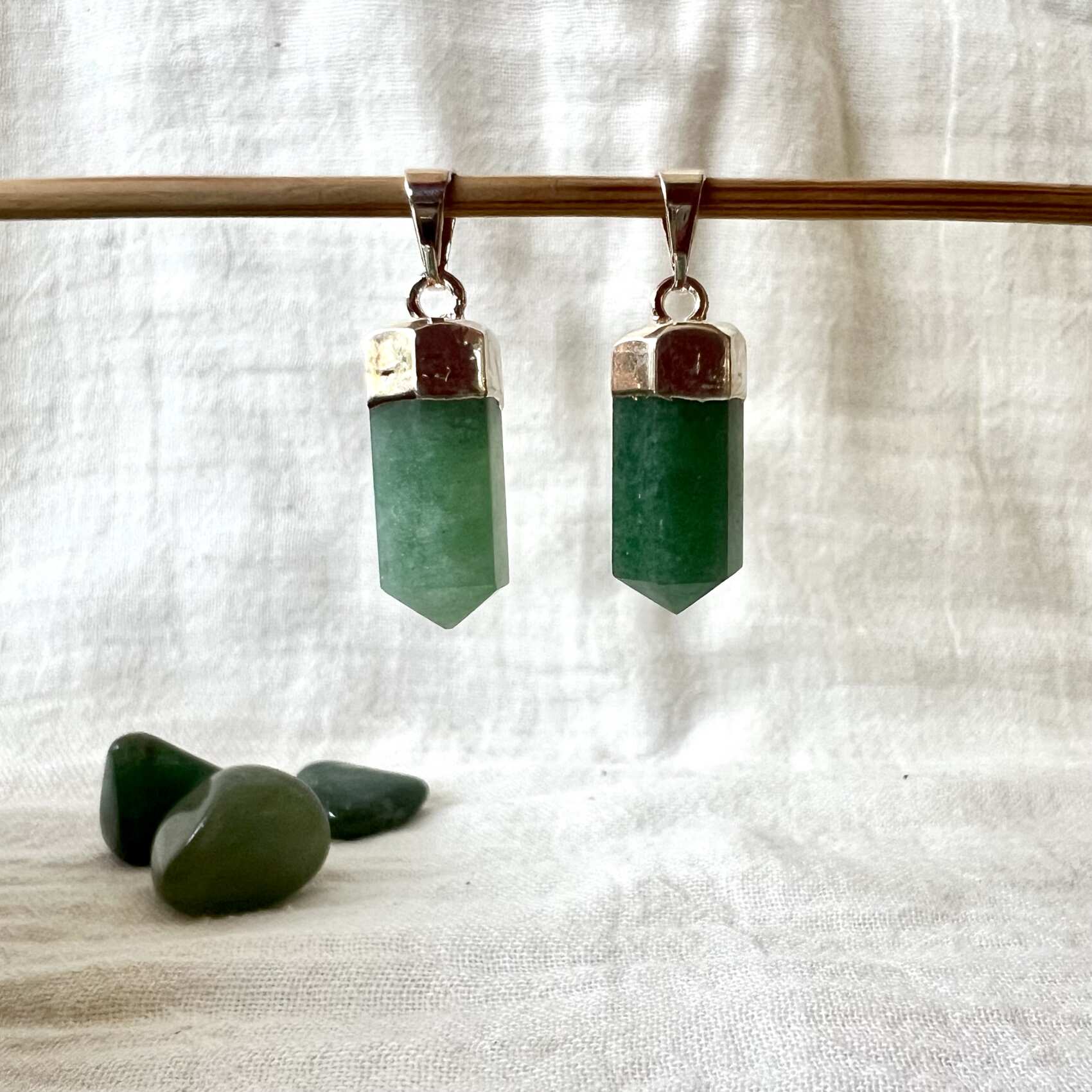 Gorgeous rich green aventurine pendants, simply set to show off this superb natural green quartz to great effect, a wonderful heart chakra crystal that strips us back to basics and balance.