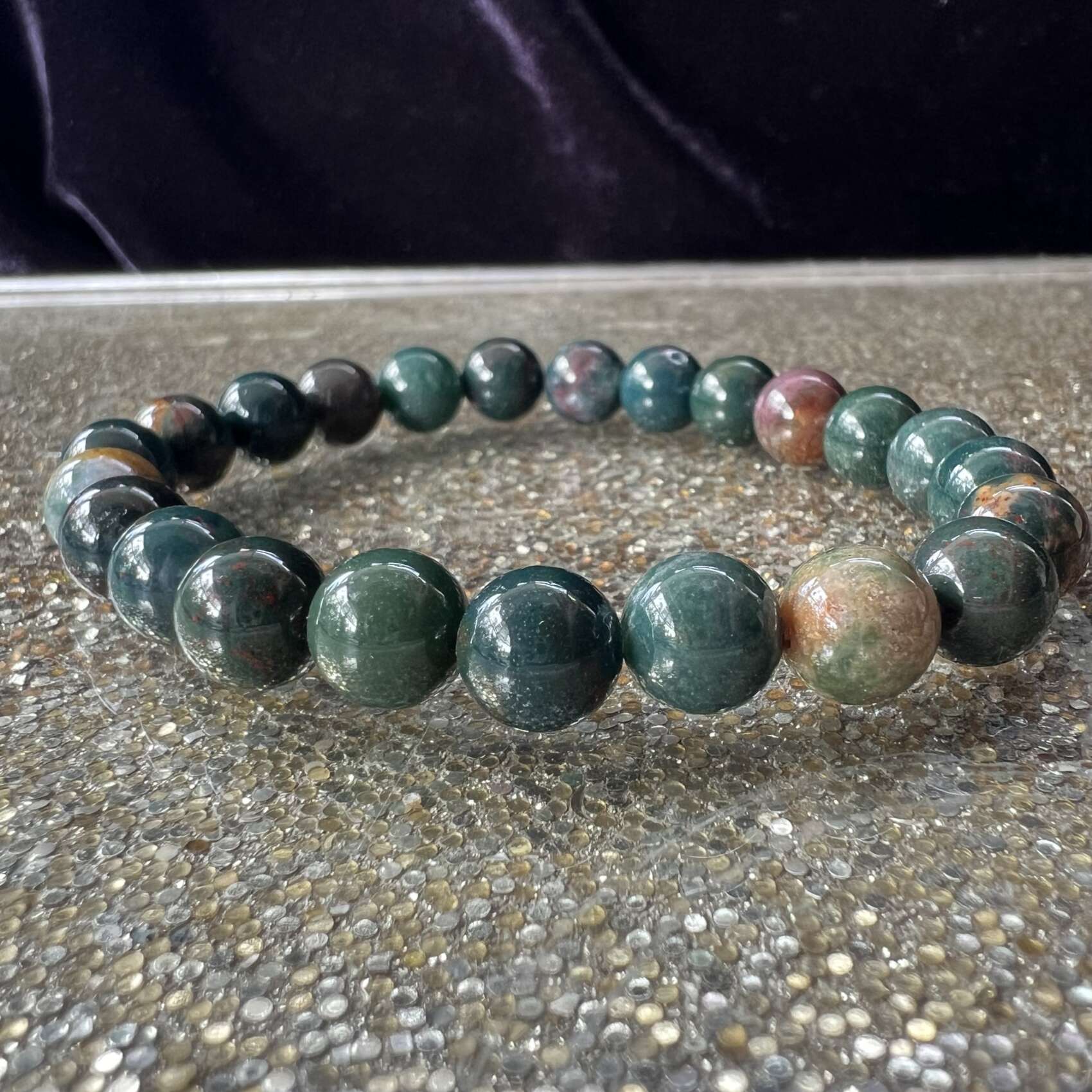 A form of chalcedony, dark green with inclusions of iron oxide or hematite.