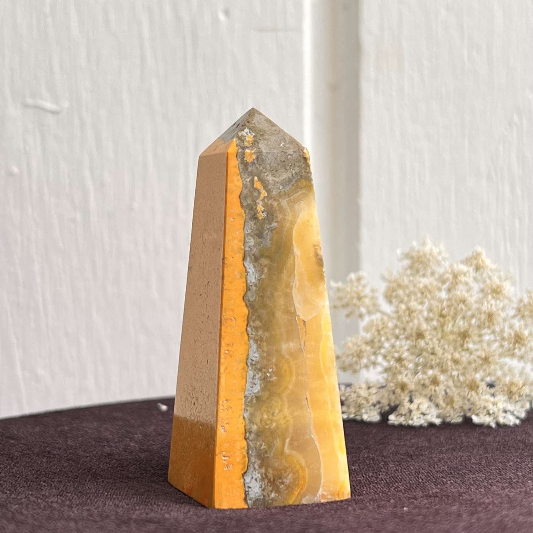 A bright bumble bee obelisk, with a lovely layered pattern reminiscent of it’s cousin, lace agate, with a striking yellow block covering one whole side. A really good piece of this popular jasper.