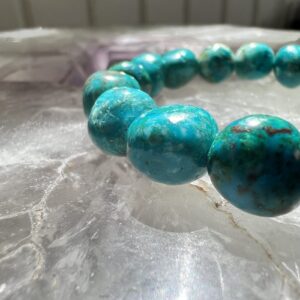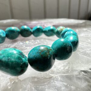 A gorgeous chrysocolla bracelet made with with a fantastic range of tumblestone beads with the distinctive rich natural colours that make this mineral so special and distinctive.