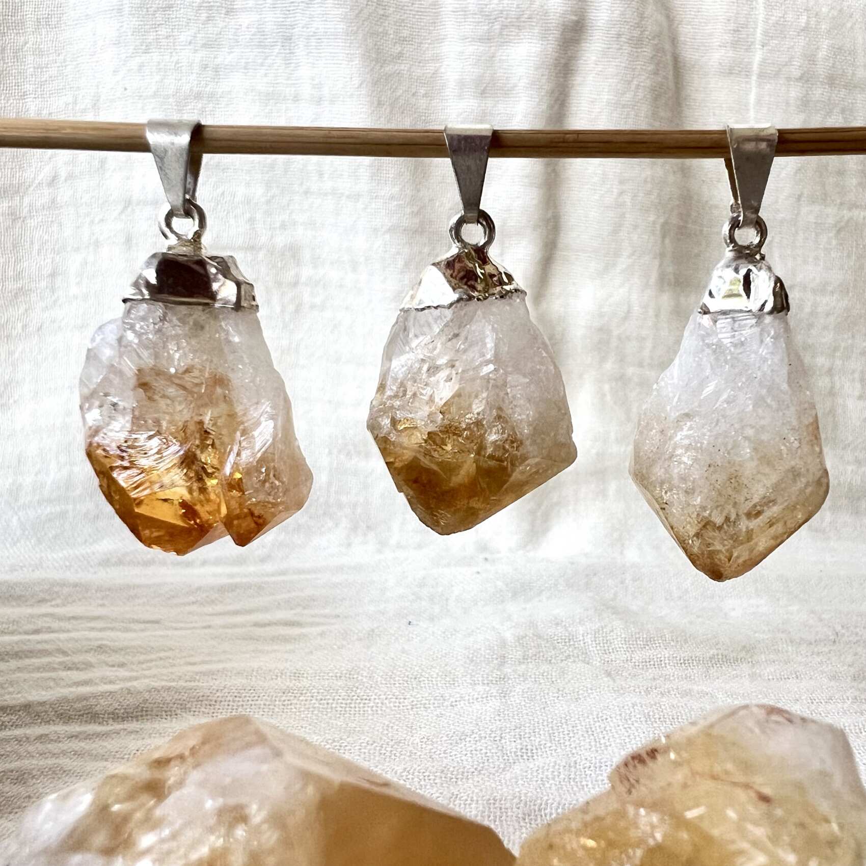 Such lovely natural citrine point pendants, ancient crystals from deep within our earth, simply mounted to create a pretty and vibrant necklace. Perfect for a boost to our confidence, vitality and creativity.