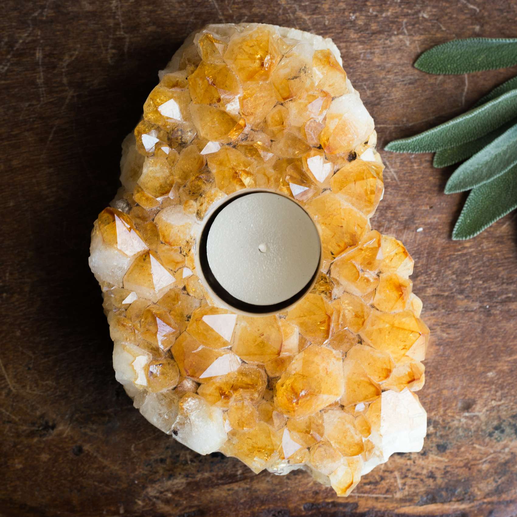 A beautiful citrine cluster, with a central well for a tea light which when lit, creates a beautiful play of light through the crystal points, with velvetine cloth on the base.