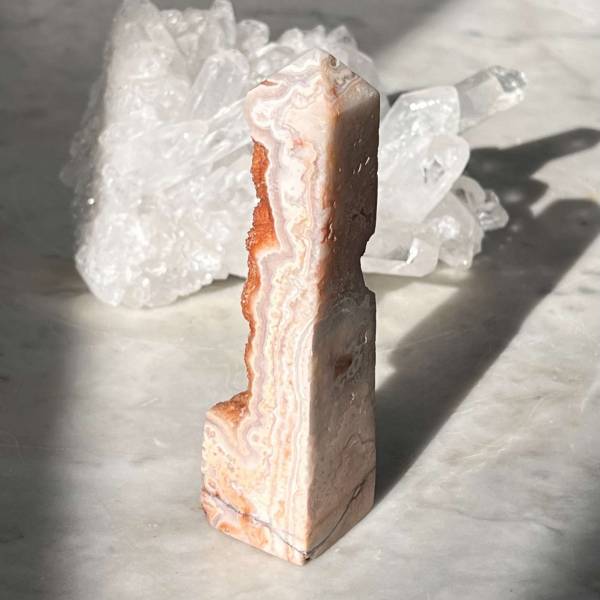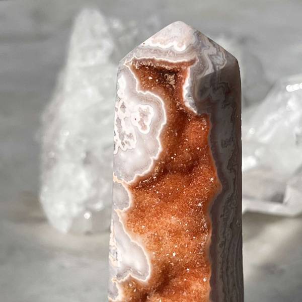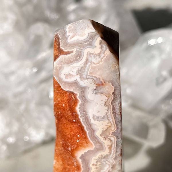 A colourful and wonderful obelisk of crazy lace agate with highly complex folded, splaying layers and sparkling orange druzy. Amazing.