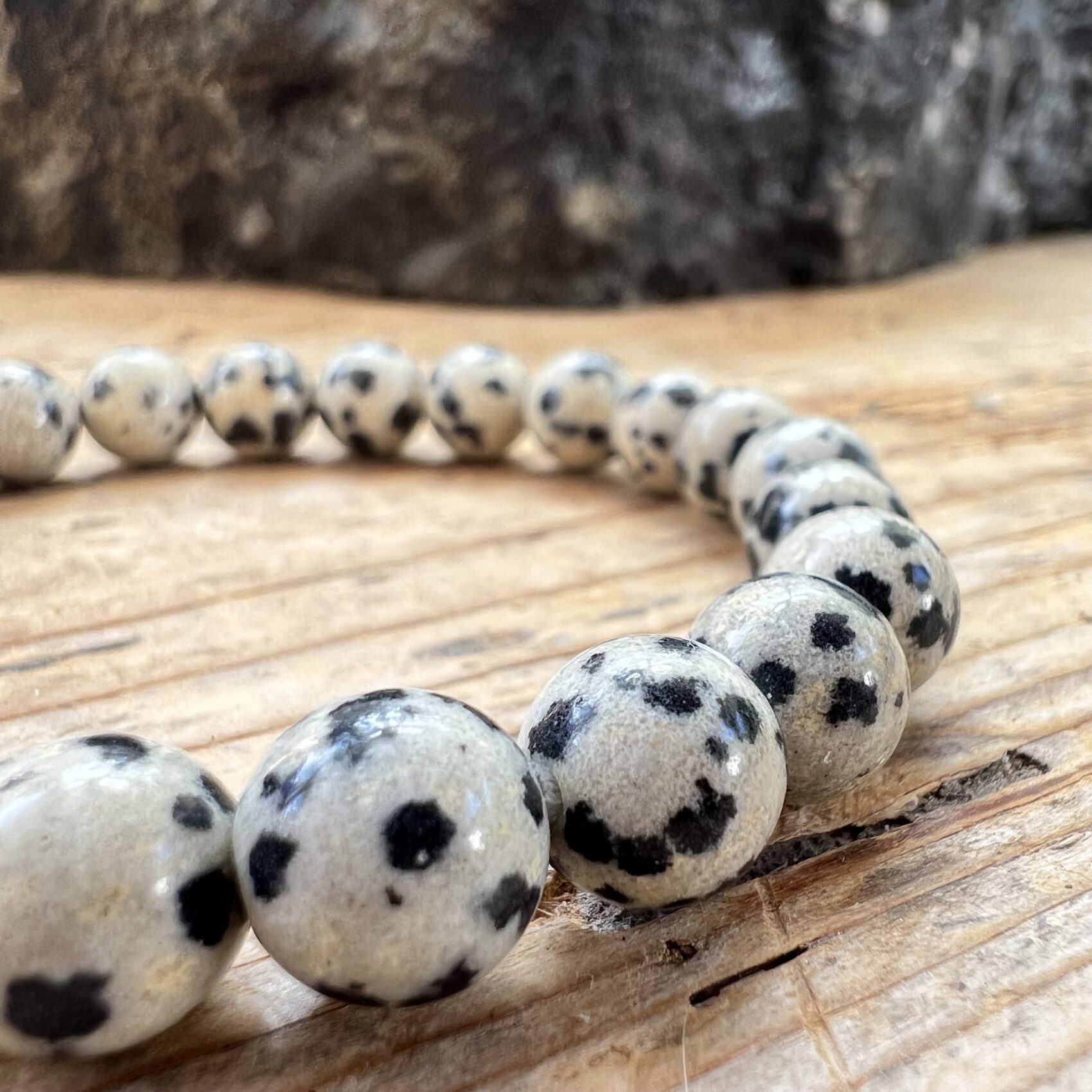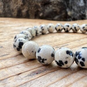 A stunning round bead dalmatian jasper bracelet, a wonderful speckled creamy jasper, distinctive, grounding and unique.