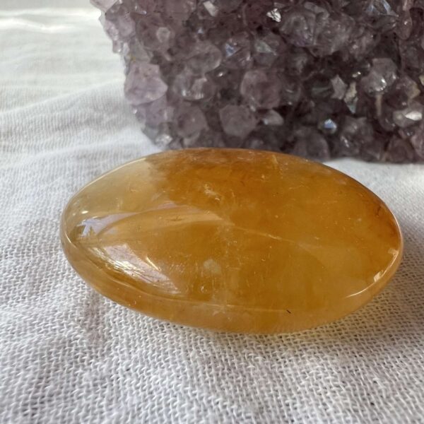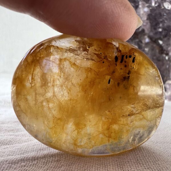 A large golden quartz tumblestone with two flatter sides, so it feels like a palmstone. A gorgeous piece of natural quartz with an incredible inner pattern of facets and inclusions.