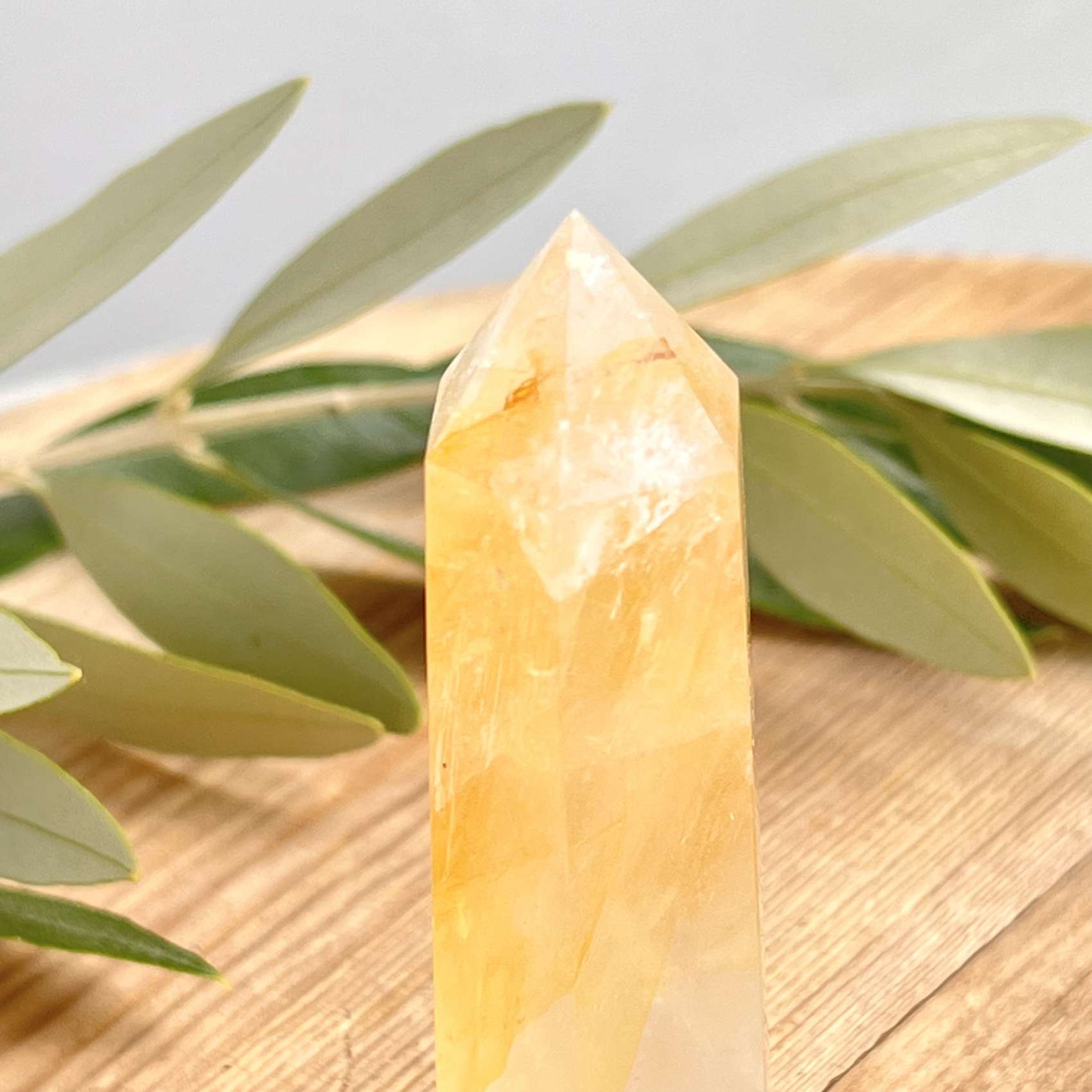 A golden quartz tower, six sided to a sharp point, this is a wonderful example of quartz with iron inclusions looking almost algae like with their wispy structure.