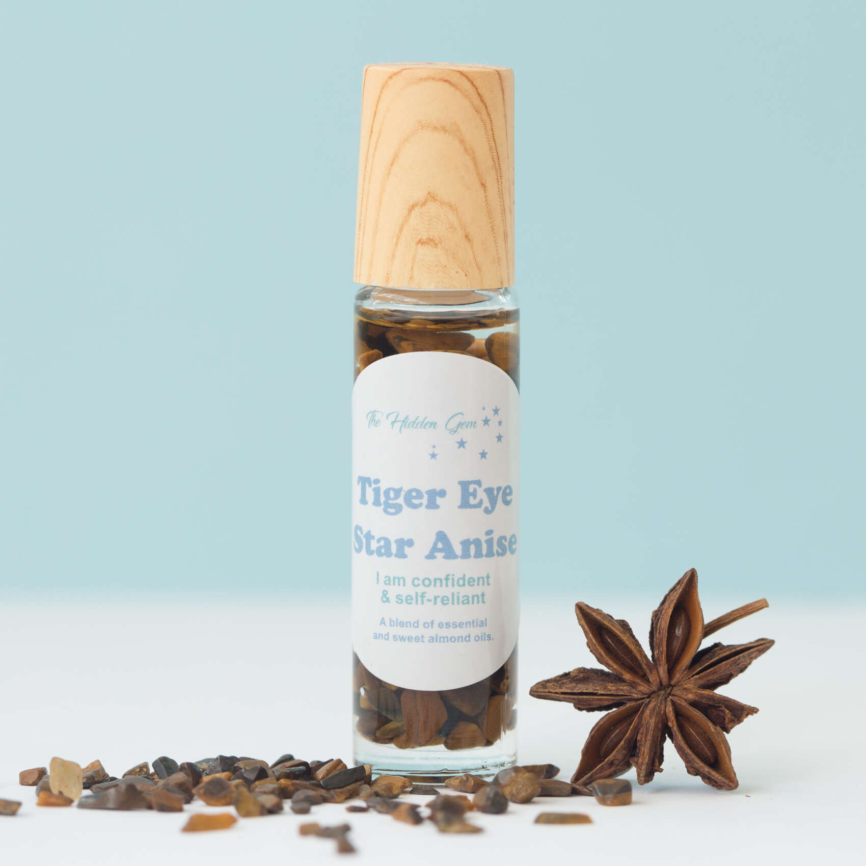 A positive affirmation oil with tiny, smooth pieces of natural golden tiger eye in a glass bottle with bamboo lid, golden tiger eye roller ball and blended star anise essential oil with the single affirmation, ‘I am confident and self reliant’.