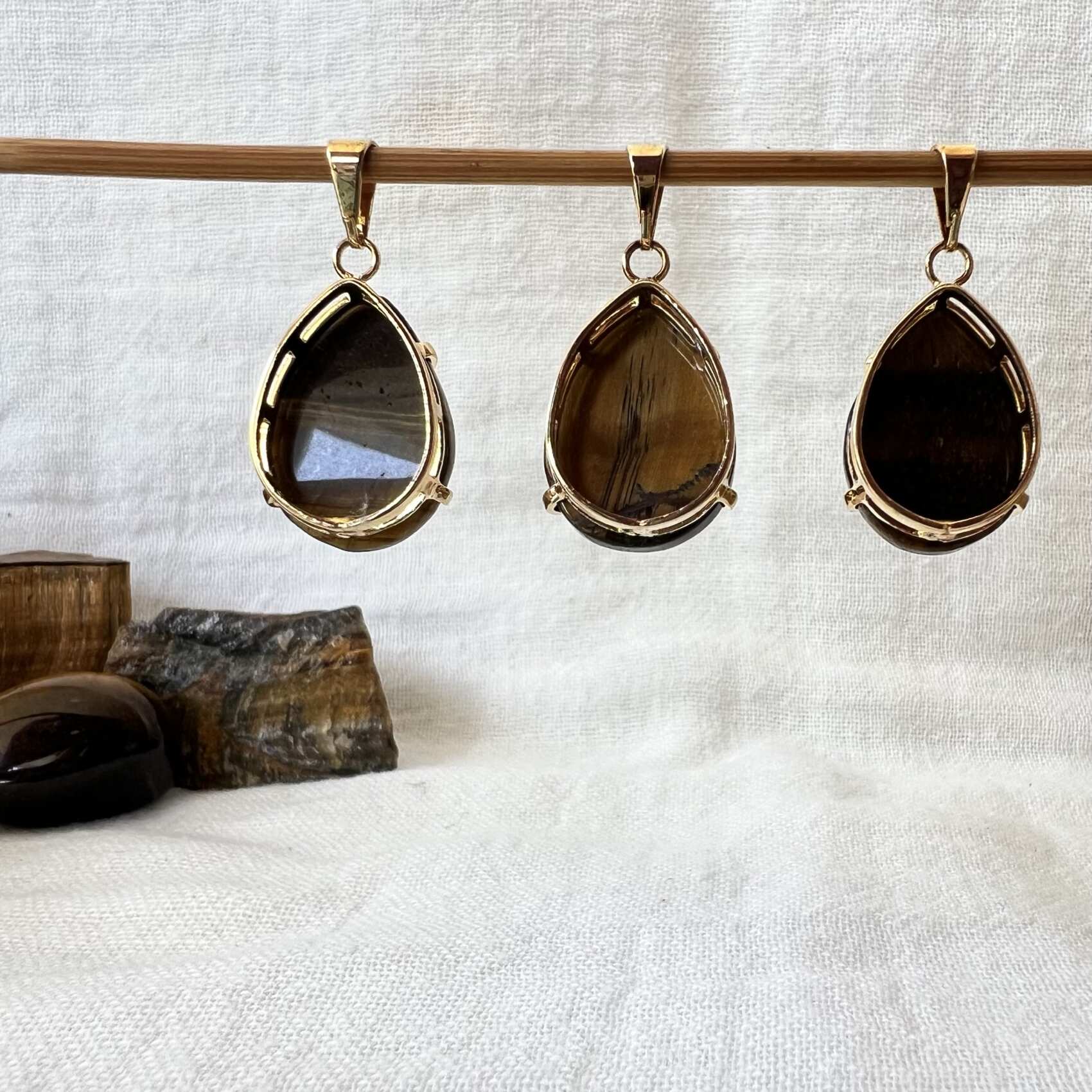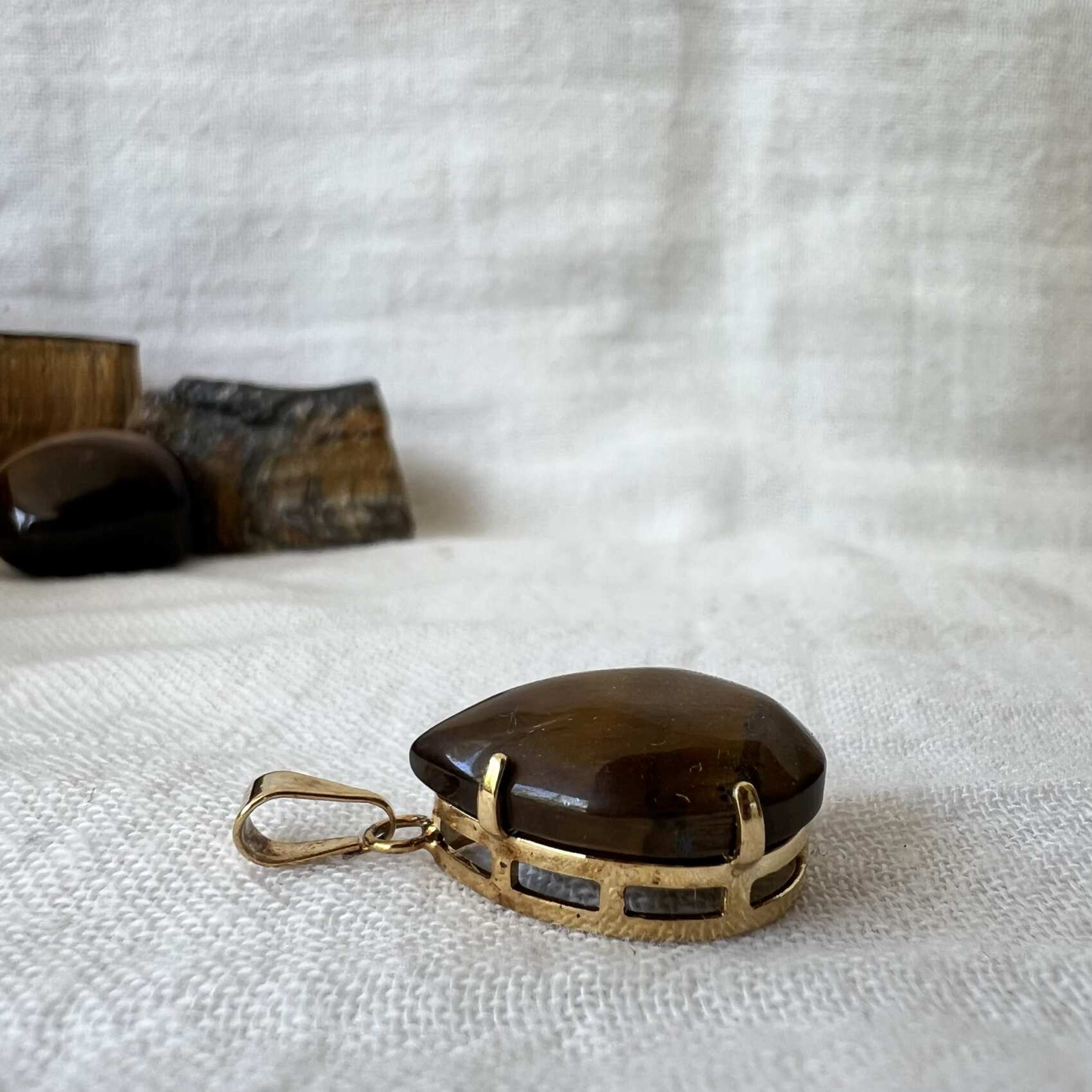 A natural tiger eye pendant, shaped and polished into a simple drop shape, set off beautifully by the raised gold plate setting which allows natural light through the gemstone even when it is being worn.
