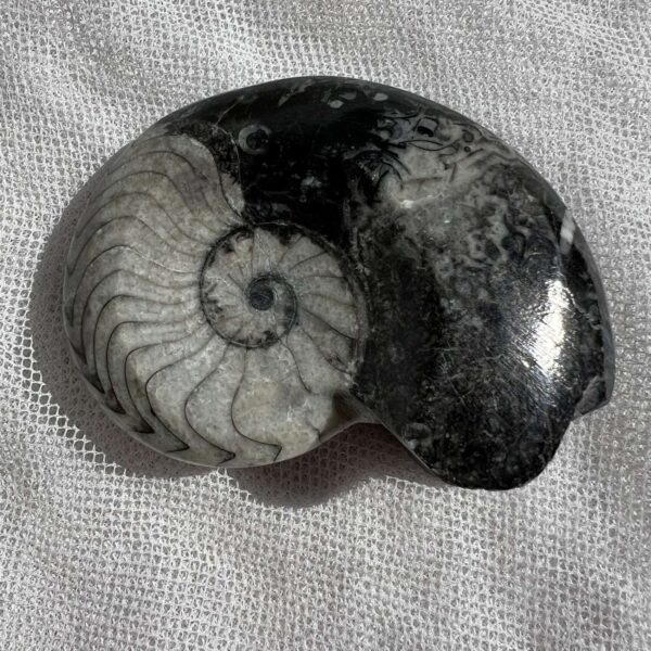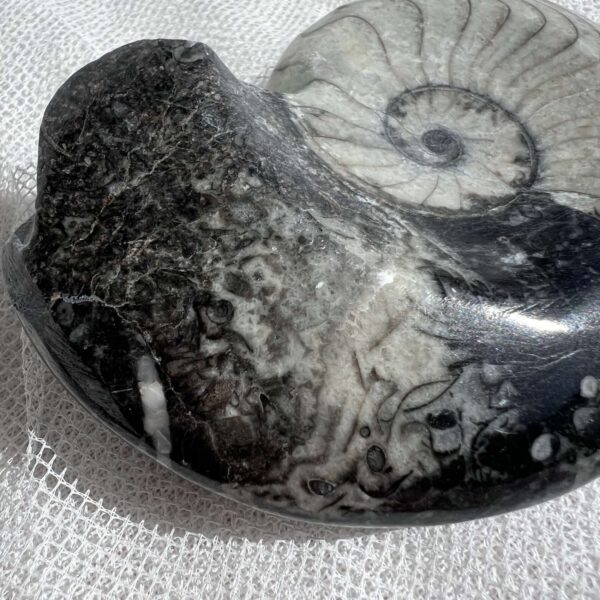 Each chamber is the result of the way the creature grew; starting life in the centre as a tiny hatchling, as it got bigger, it created a thin septa or chamber wall behind itself which over time, built the spiral we see in the fossilised remains. The living animal always inhabited the largest front chamber building up the shell throughout its life span. The largest found are about 15 cm across.