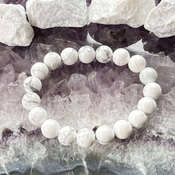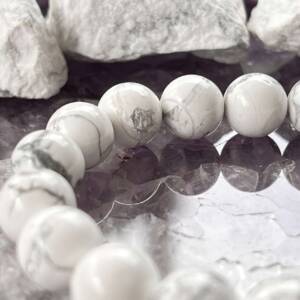 A bright white howlite bracelet, with marble like grey veining, perfect for everyday wear or to pop on at night to support peaceful sleep.