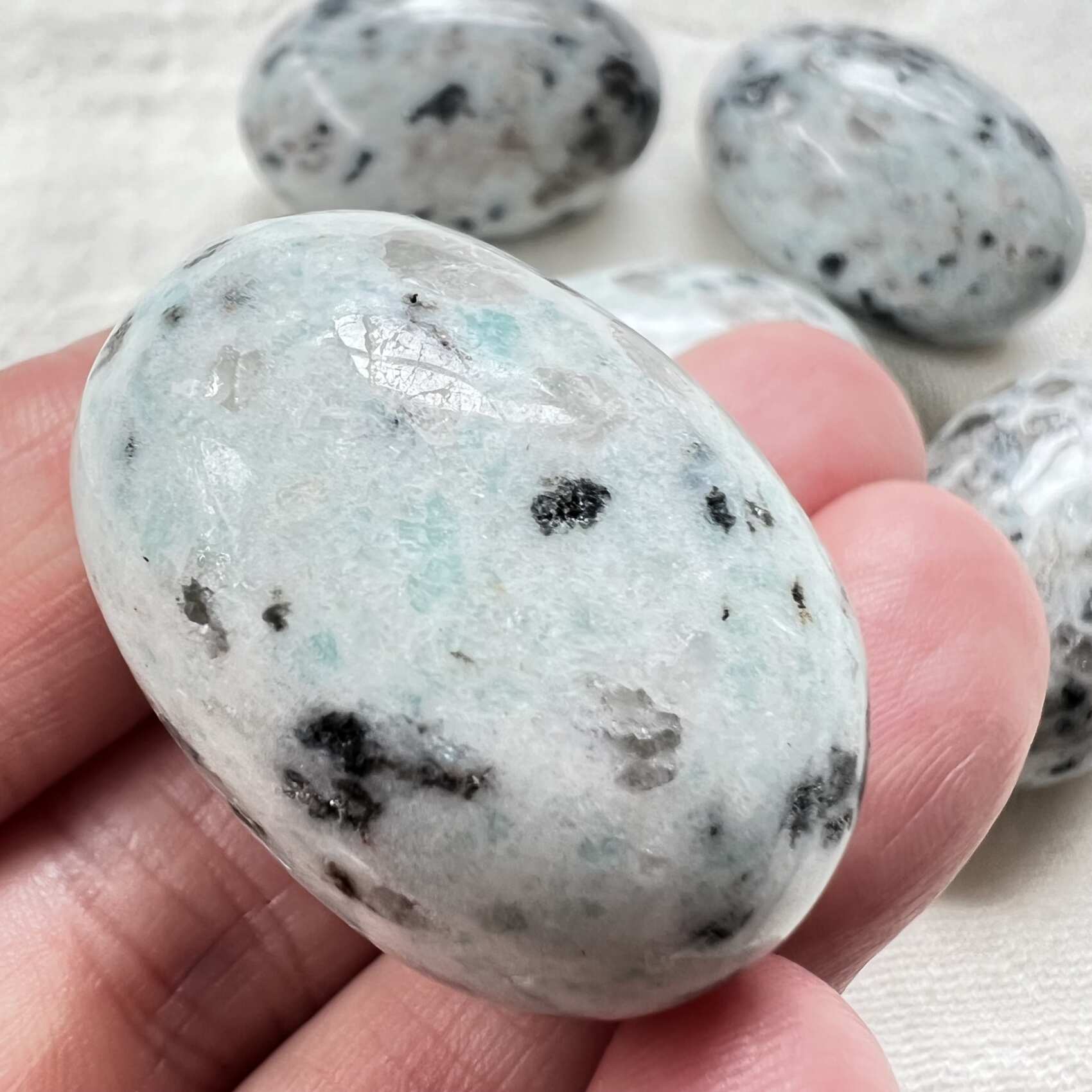 A lovely large kiwistone tumblestone with small pieces of both smokey quartz and black tourmaline in the pale amazonite. A real gem from Te Waipounamu.