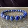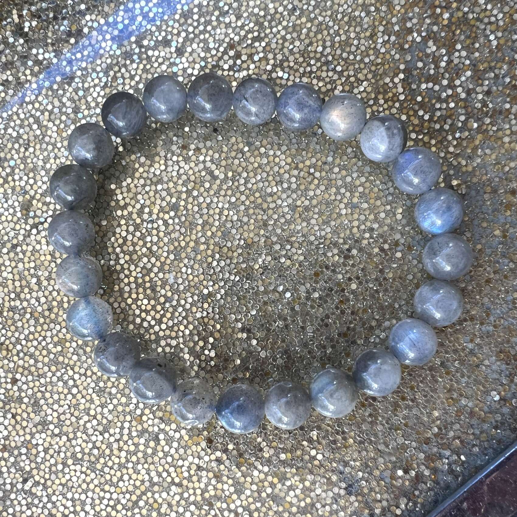 An eye catching labradorite bracelet with golden and blue flash on most of the 8 mm spherical beads, threaded with a blue elastic.