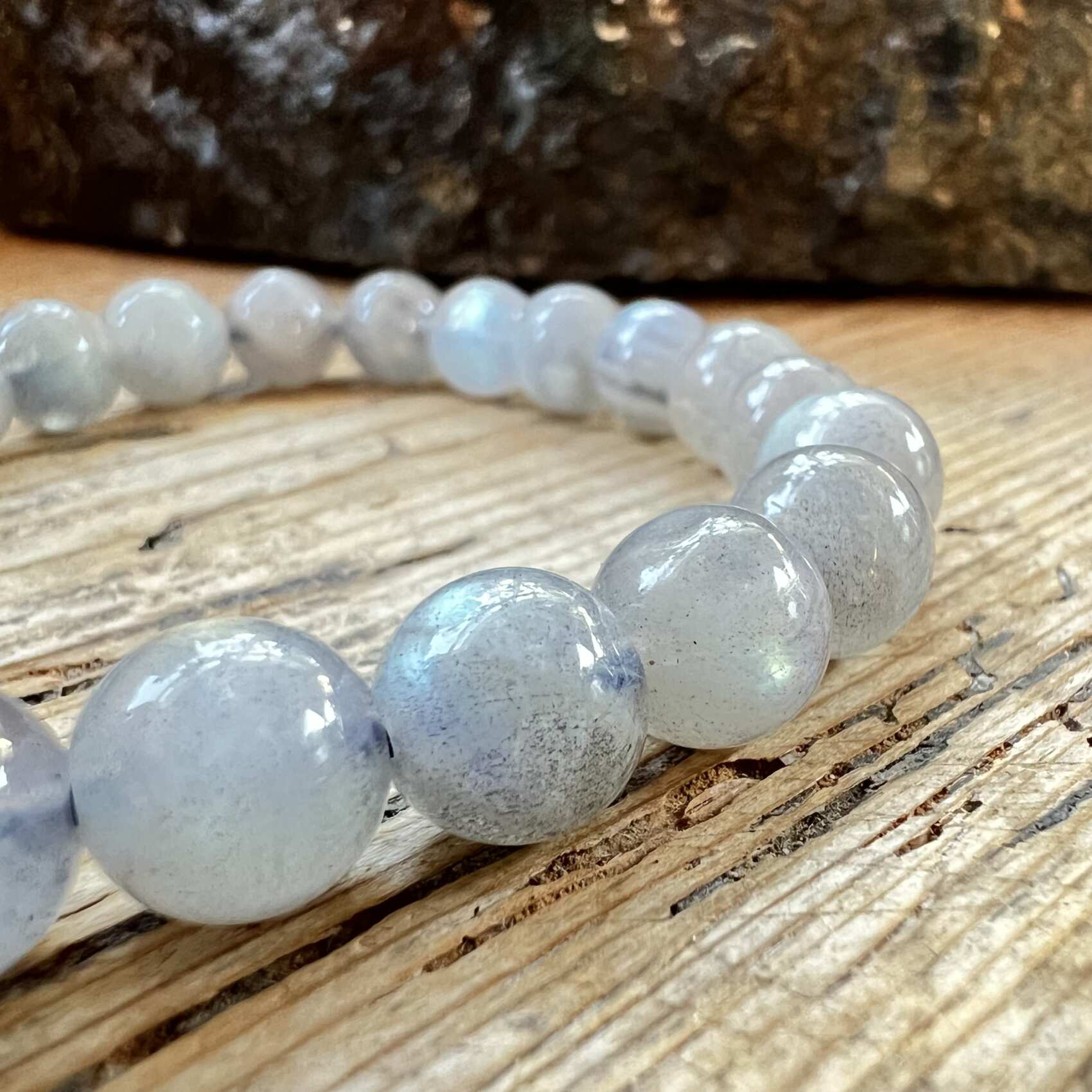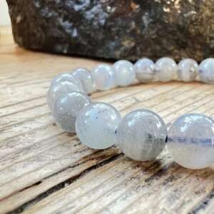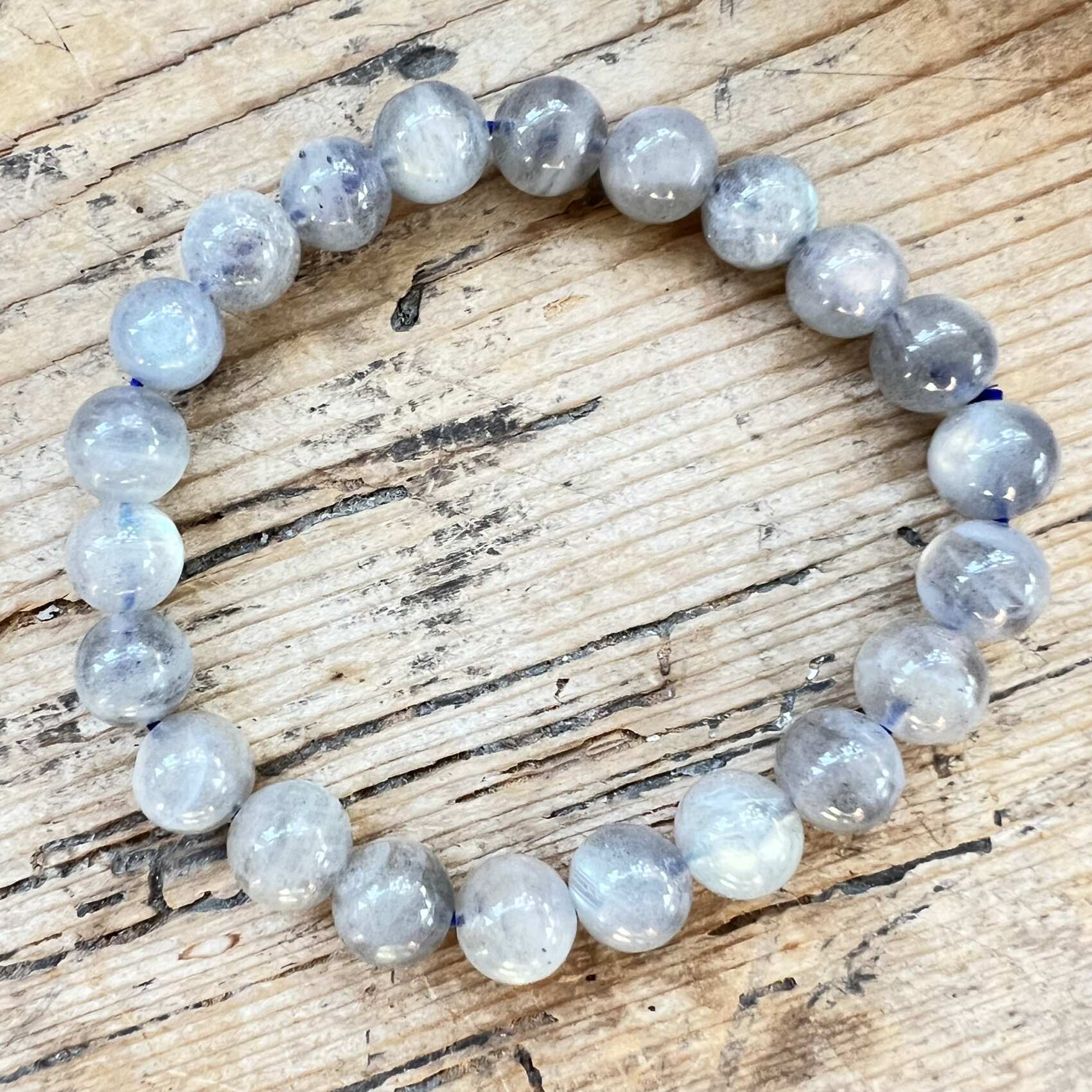 A simple labradorite bead bracelet made from 8 mm round, polished beads, double threaded on blue elastic. A lovely way to wear your crystals.