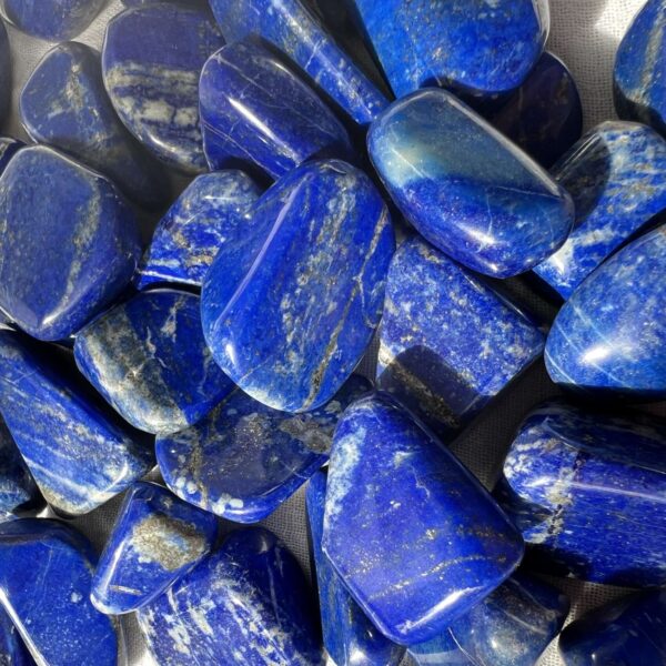 Stunning lapis lazuli tumblestones, with the golden sparkle of iron pyrite in this deep blue rock.