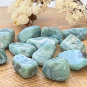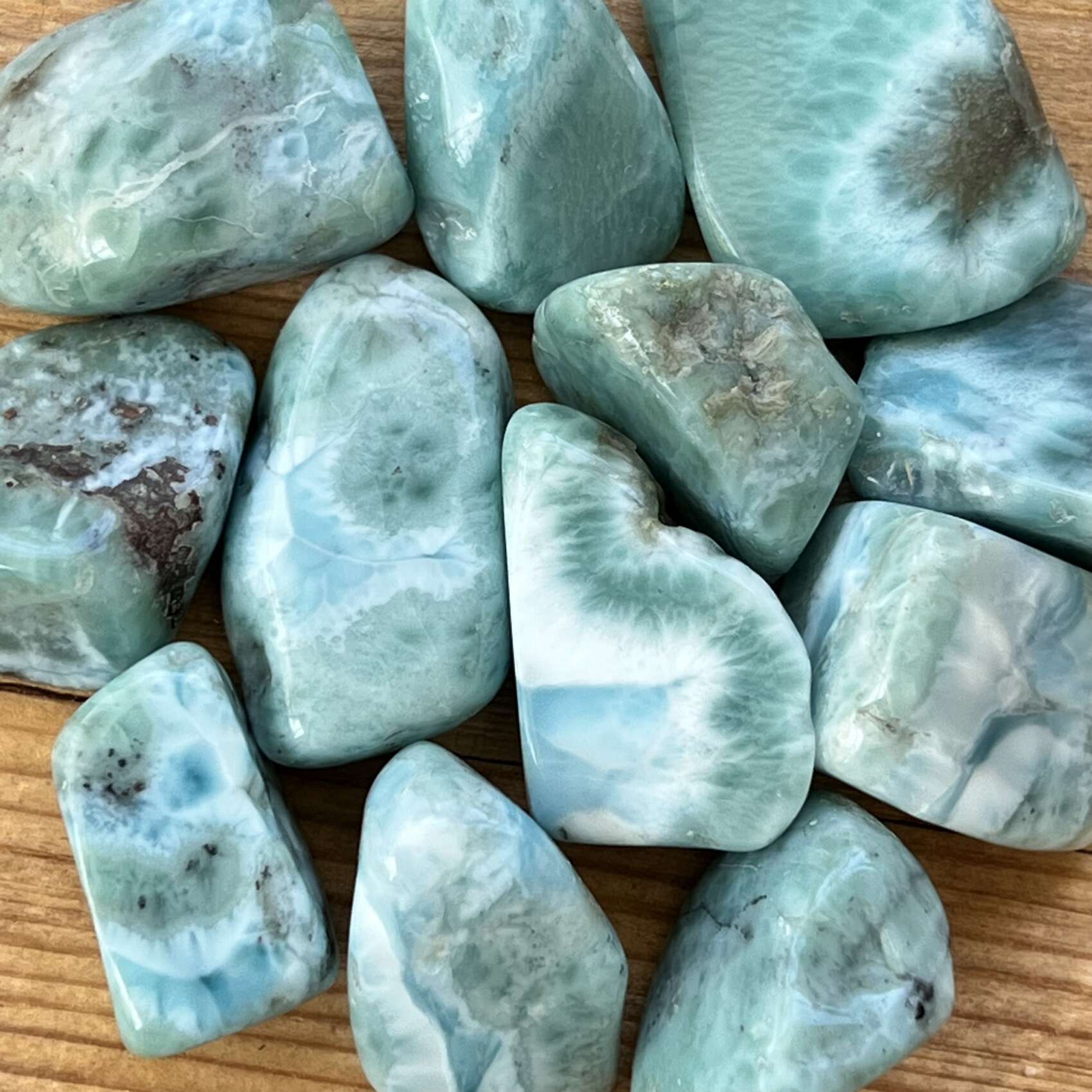 Natural pieces of larimar, polished simply by tumbling which brings out their unique colour and pattern form. Only found in one location on our earth, these are truely rare and precious.