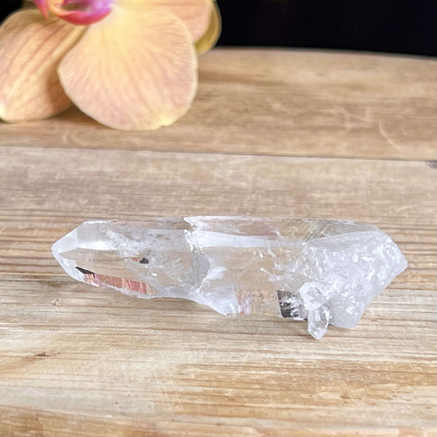 An unusual shape to this Lemurian quartz point, like an elongated triangle with two little legs at the base that are actually tiny points.