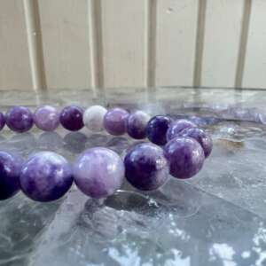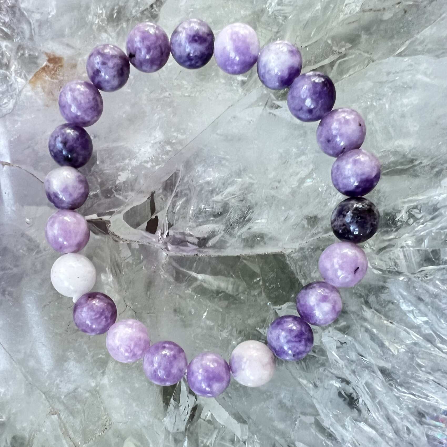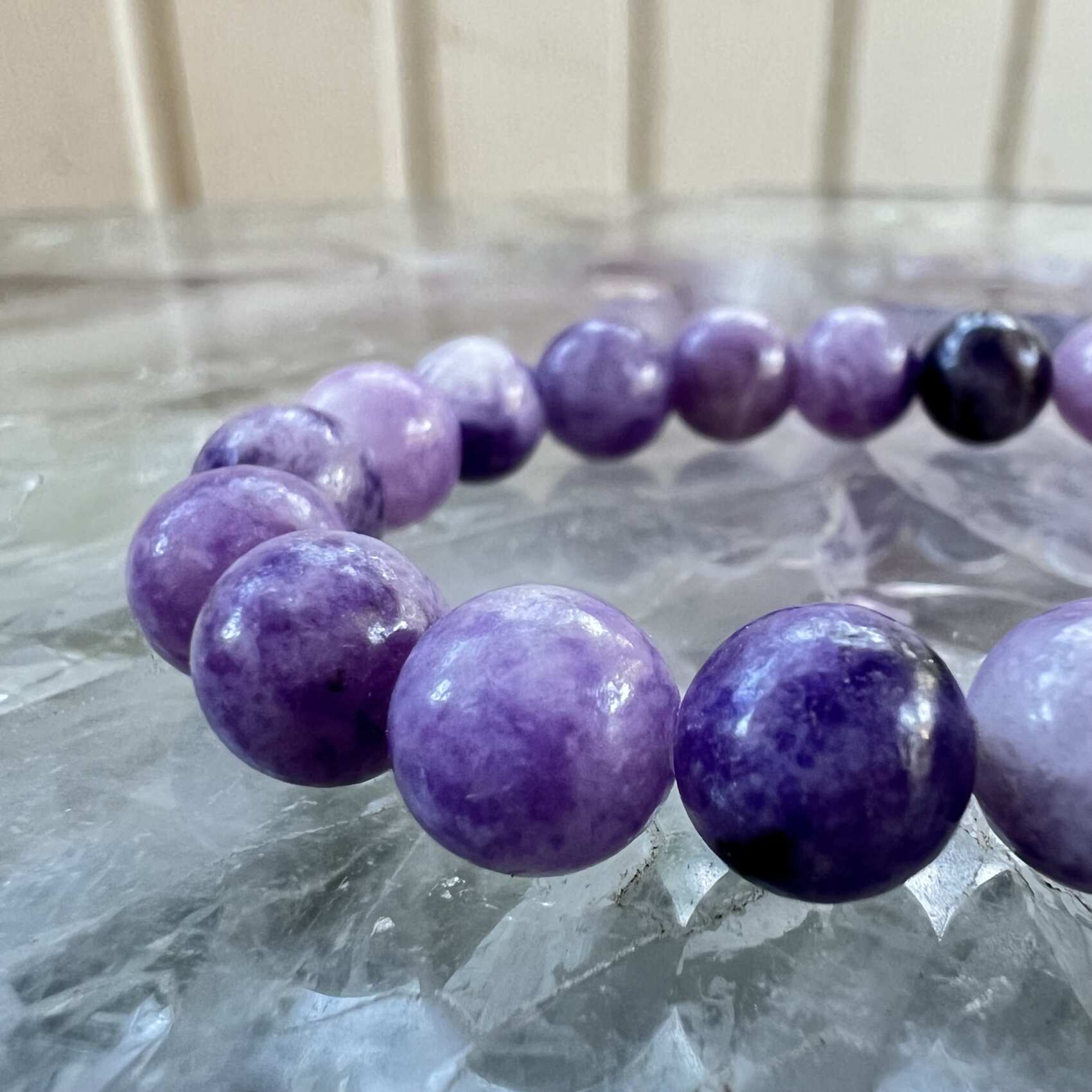A simple lepidolite bead bracelet, made from polished 8 mm beads threaded onto a double strand of elastic.