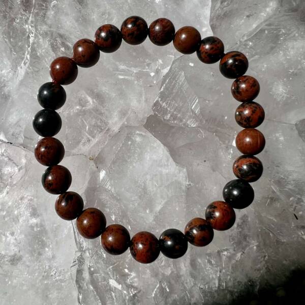 A mahogany obsidian bracelet, which is an unusual type of this common volcanic rock, a brown and black silica rich glass. Each bead is a simple sphere, polished smooth and threaded with elastic.