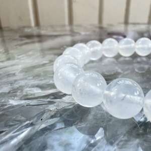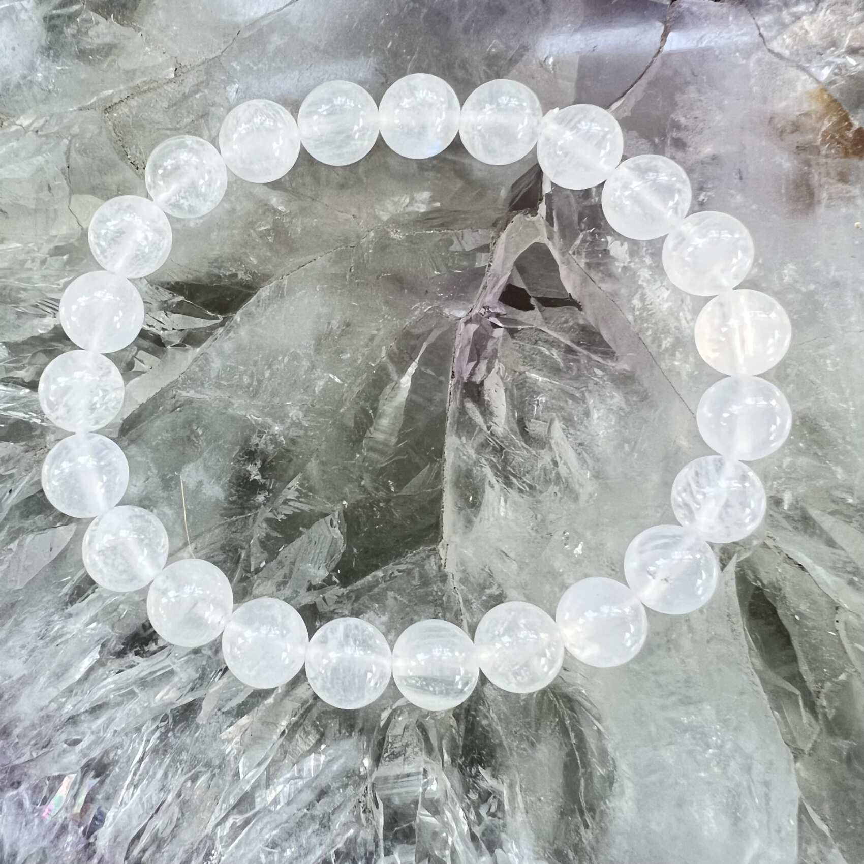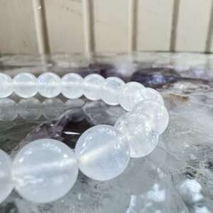 A stunning moonstone bracelet strung simply with 8 mm round beads, polished to a high fine shine, on a double strand elastic. Love it.