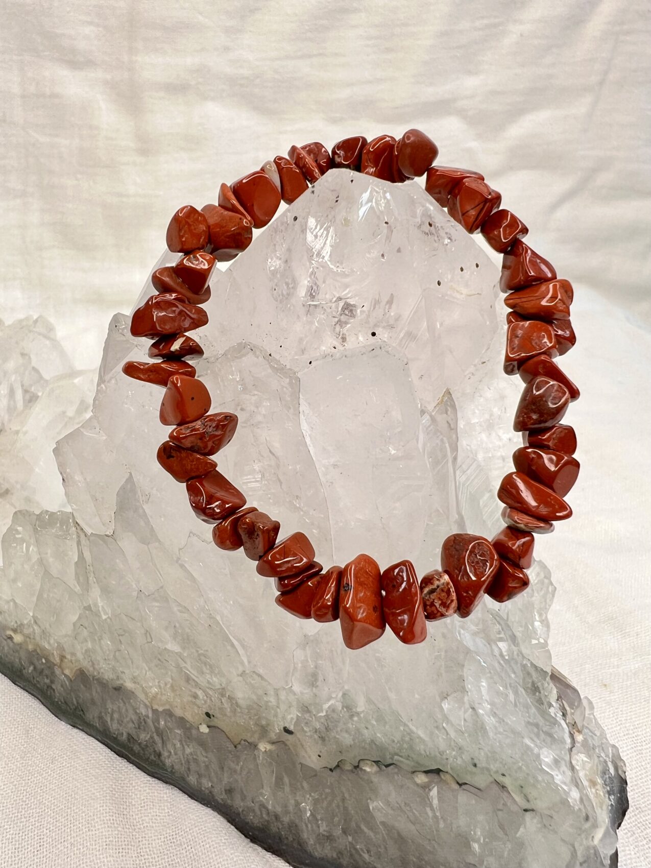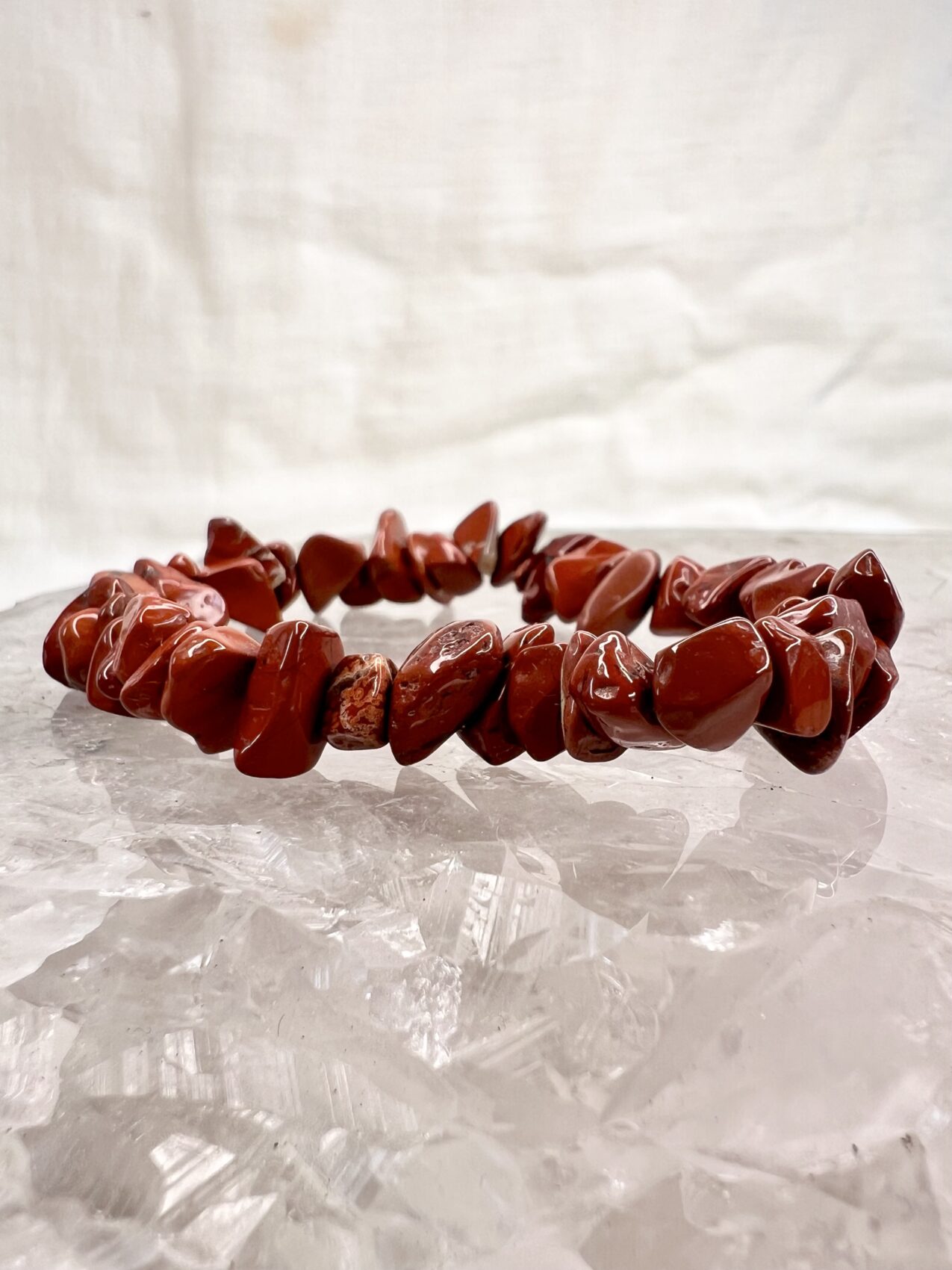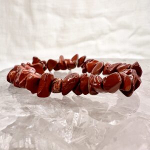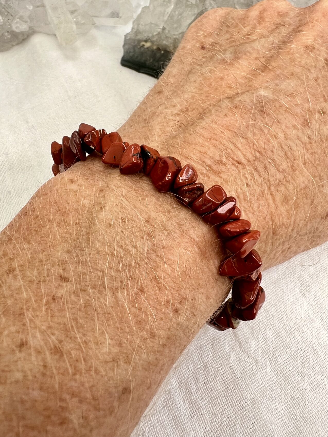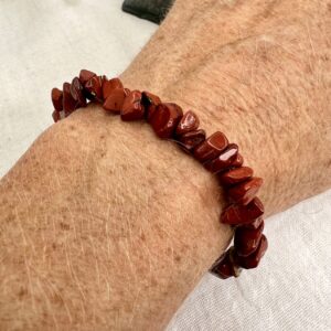 A simple red jasper bracelet, made with small polished crystal chip beads. A great way to use the waste from cutting larger items, I love the natural simplicity of these bracelets.