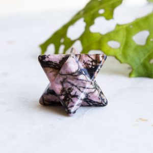 A lovely balance of pink and black pattern across this rhodonite merkaba, brings the symbolism to life.