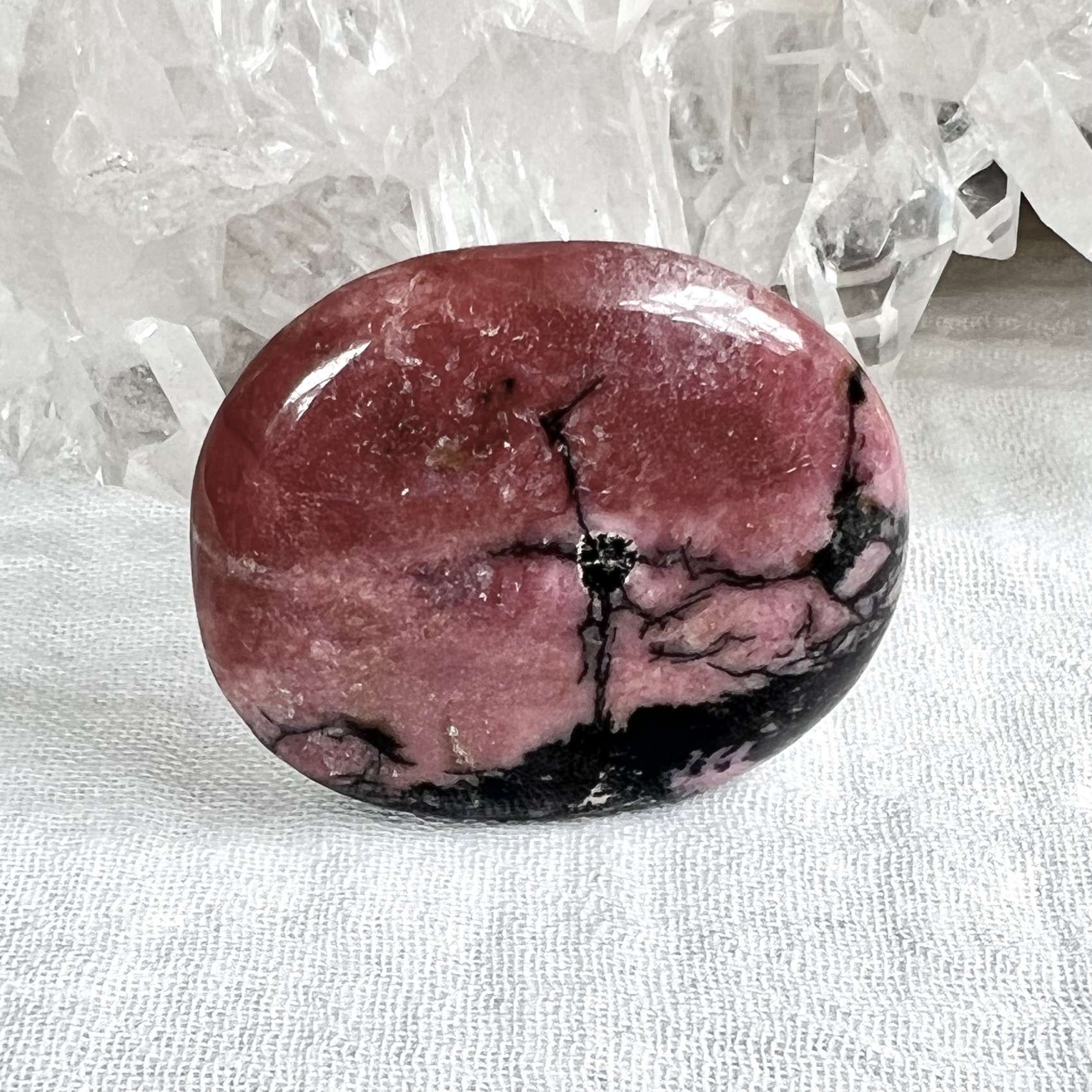 A strong pink rhodonite palmstone, with vivid black contrasting veins running throughout this piece. A total one off piece for the heart chakra and good energy flow generally.