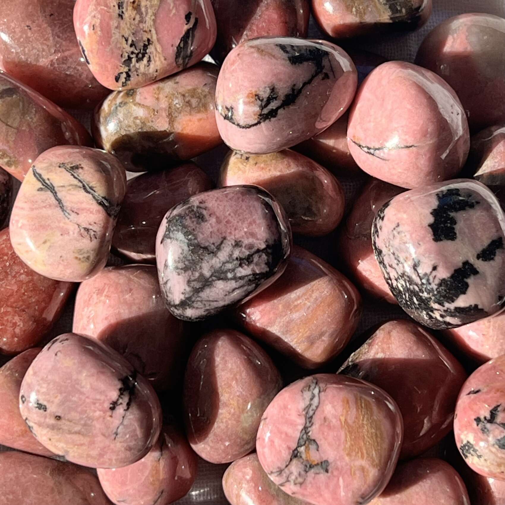 Some lovely polished rhodonite tumblestones with lots of distinctive black veining contrasting against the soft mid pink of this delightful mineral.