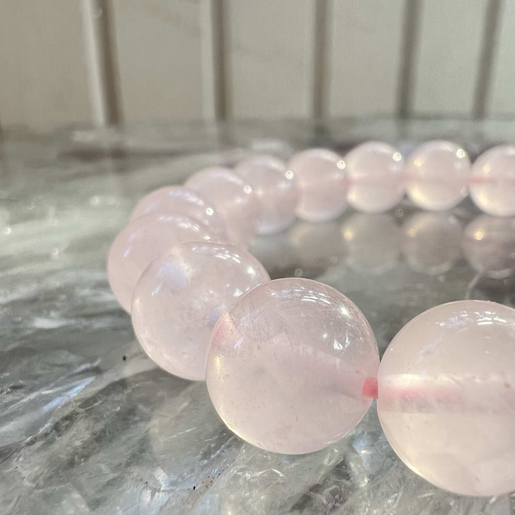 A rose quartz bead bracelet made with chunky polished 10 mm sphere cut beads on a pale pink elastic, double strung for extra durability.