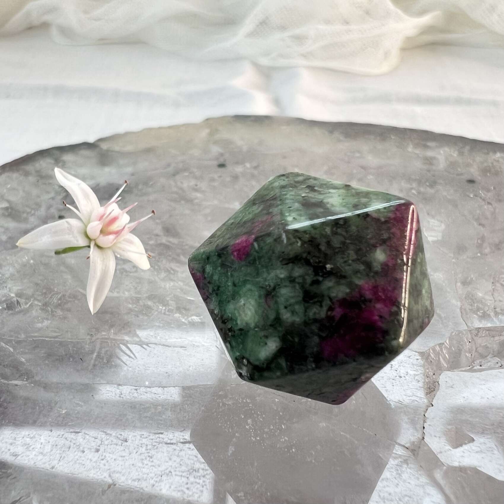 A deep red corundum in a green, black speckled orthorhombic silicate; a variety of tanzanite.