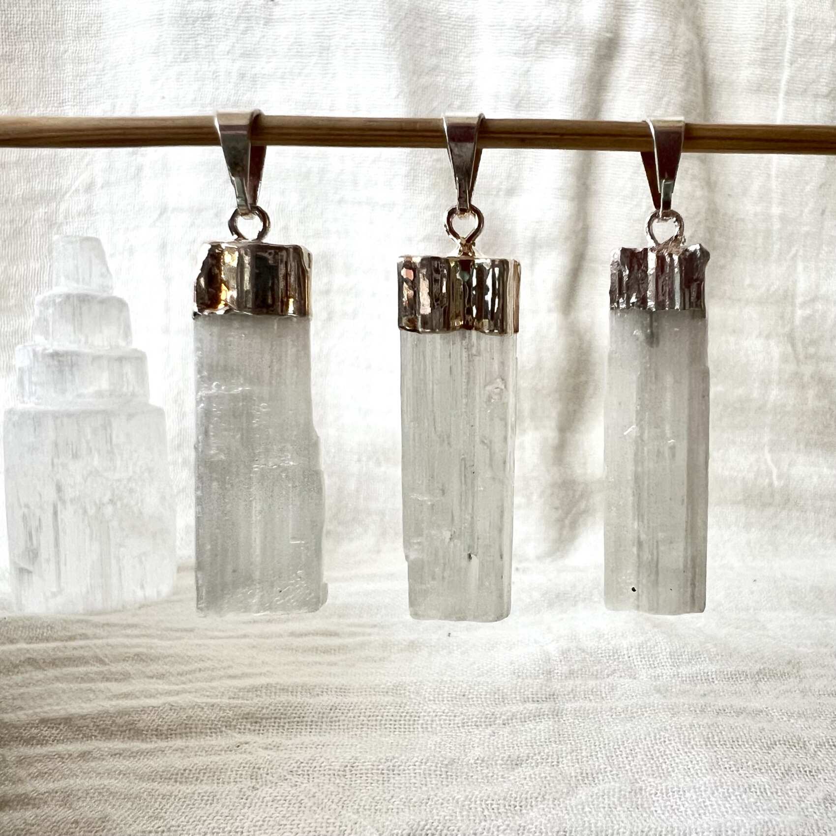 A natural white shard selenite pendant, simply set, simply beautiful and simply transformative.