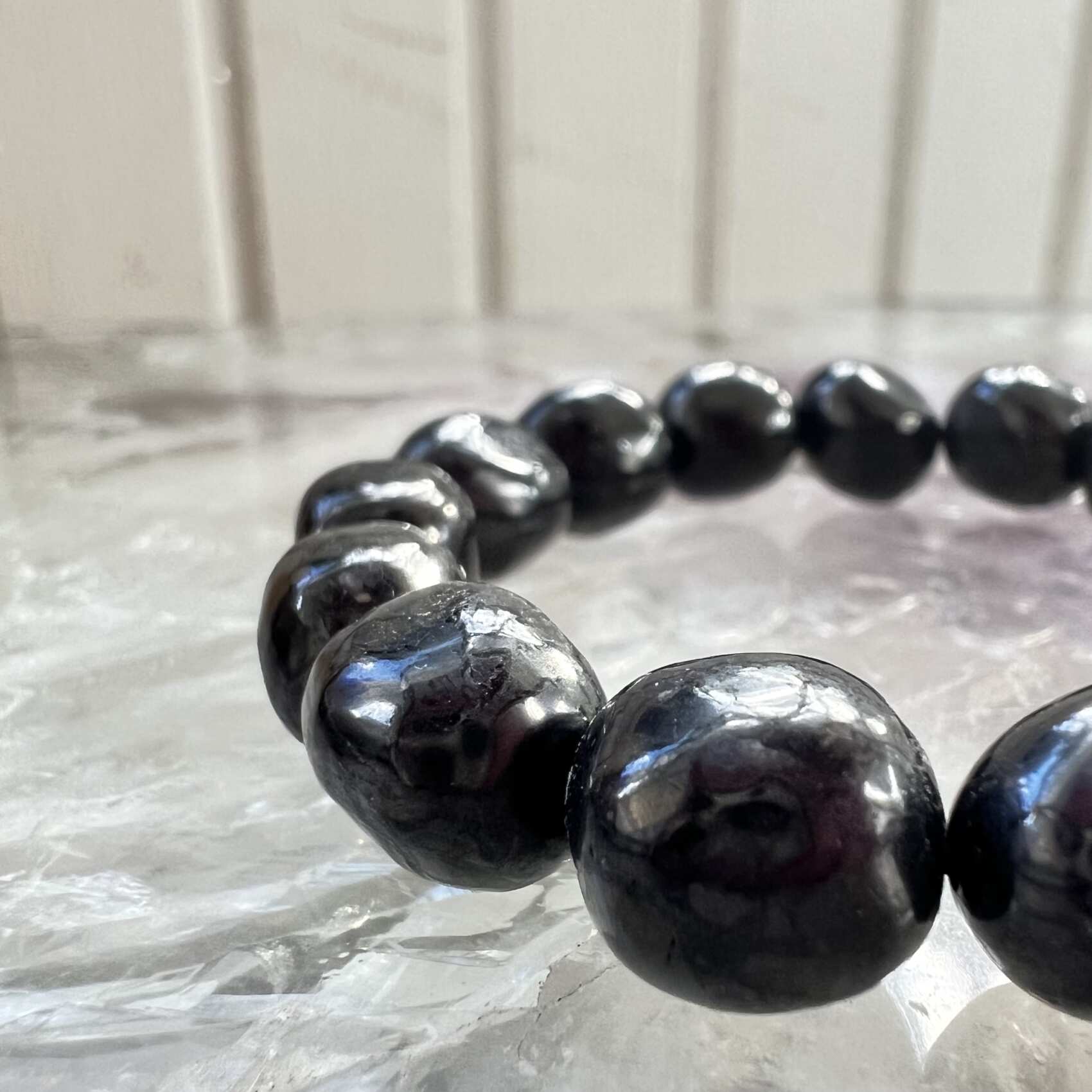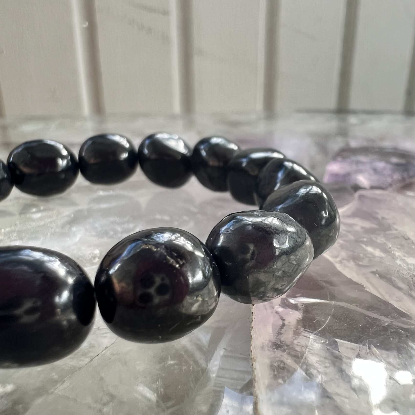 A tumble polished shungite bracelet, the beads are a range of sizes and shapes and double threaded on black elastic. Unique. Gorgeous.
