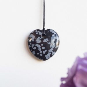 A simple heart shaped pendant of pure black obsidian filled with masses of natural snowflake pattern.