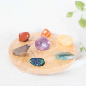 A beautiful round wooden stand, with spaces for 7 crystals or spheres.