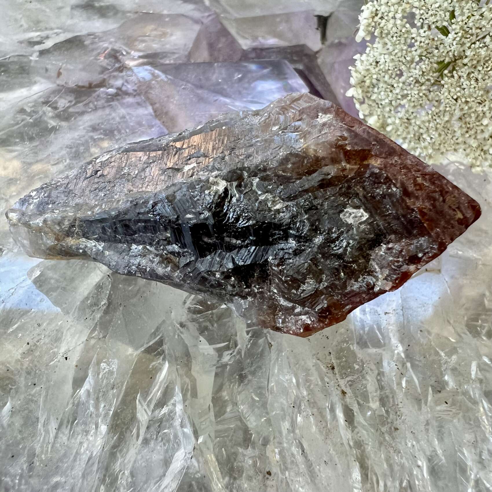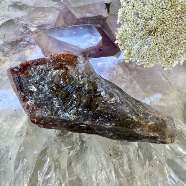 A crystal combination of amethyst, smokey quartz, clear quartz, cacoxenite, rutile, goethite and lepidocrocite.