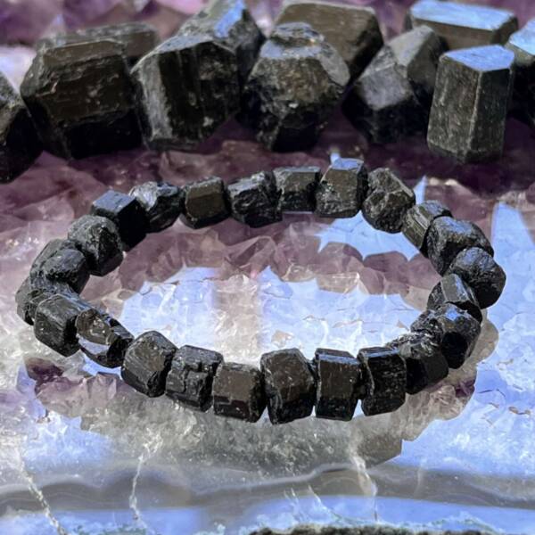 Lovely black tourmaline bracelets, made with small natural pieces of this root chakra mineral, simply drilled through and threaded with a black elastic.