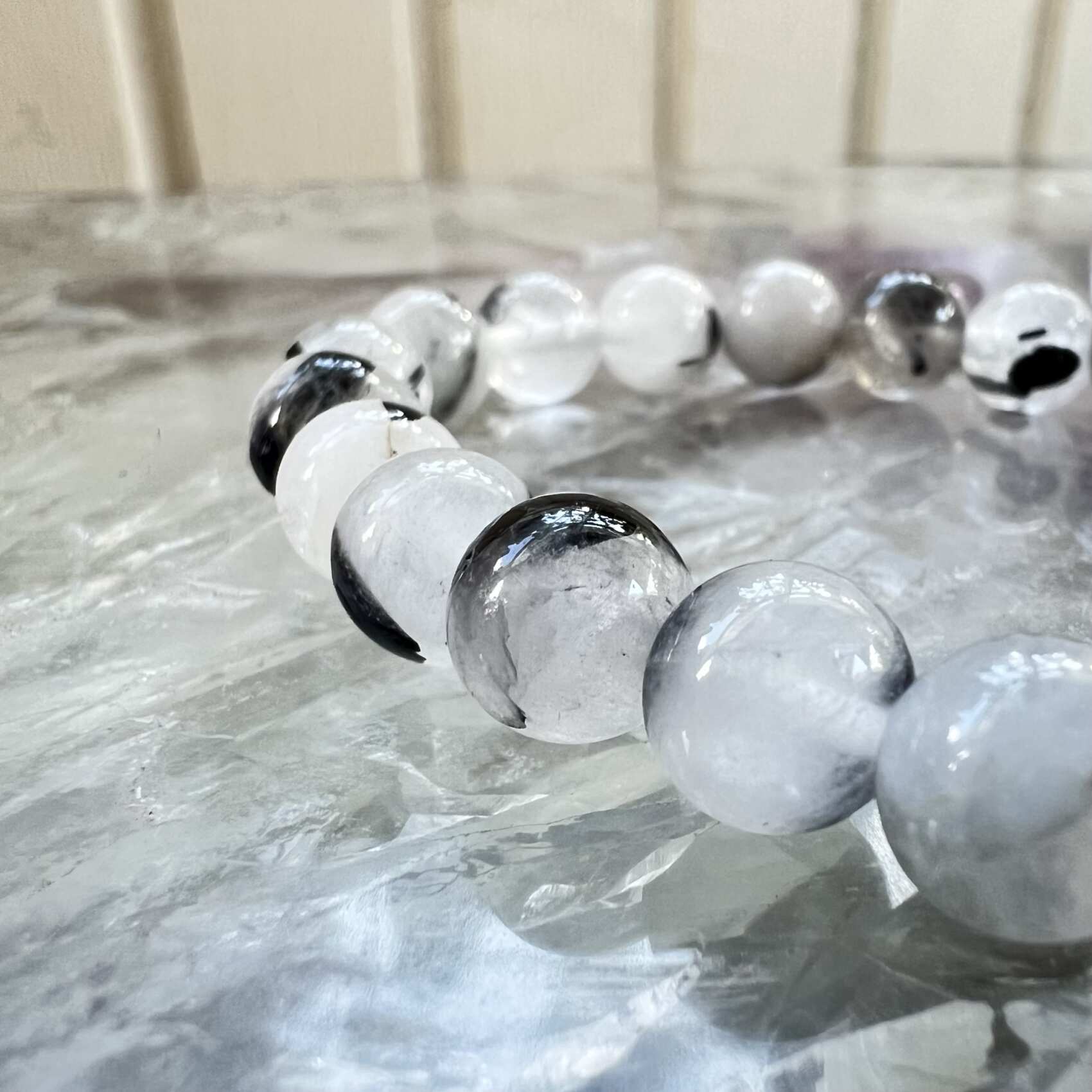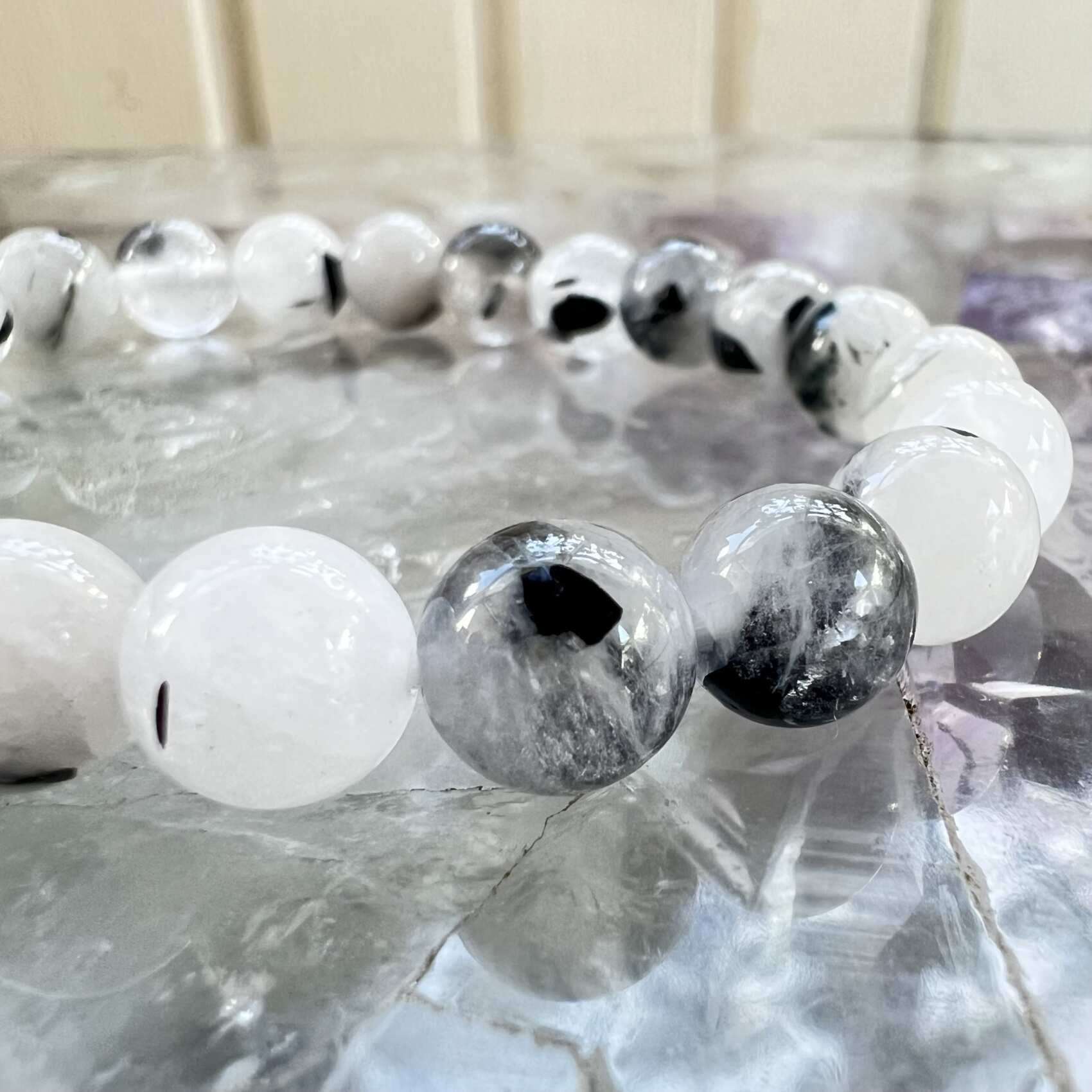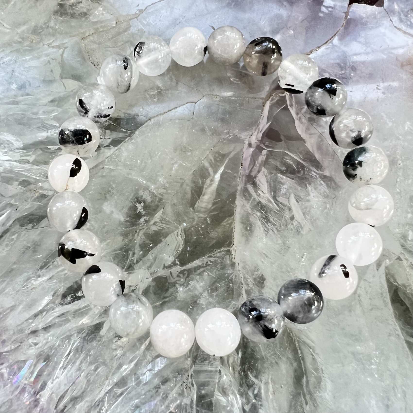 A really eye-catching 8 mm bead black tourmaline in quartz bracelet, also known as tourmalated quartz. Particularly useful for issues emanating from the root chakra, a lovely bracelet to wear for protection and confidence.